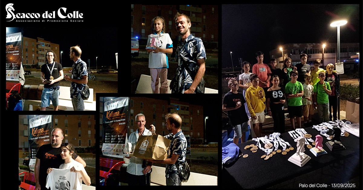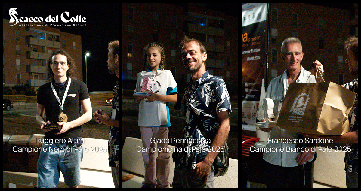 Nel torneo promozionale La Brezza il titolo di Campione Bianco di Palo 2025 รจ andato a Francesco Sardone. Per lui un trofeo in stampa 3D con il simbolico cavalluccio, oltre a numerosi prodotti da forno. In classifica generale a imporsi รจ stato invece Gaetano Lazzo, giร Campione Bianco di Auricarro 2025, che con questo successo si candida alla vittoria, nella fascia promozionale, dellโintero circuito Kalima. Nella terza fase di Scacco del Colle saranno proprio Lazzo e Sardone su una scacchiera, e Altini e Messina sull’altra a contendersi l’accesso alla quarta fase: la scacchiera gigante con figuranti che verrร realizzata durante il carnevale 2026.