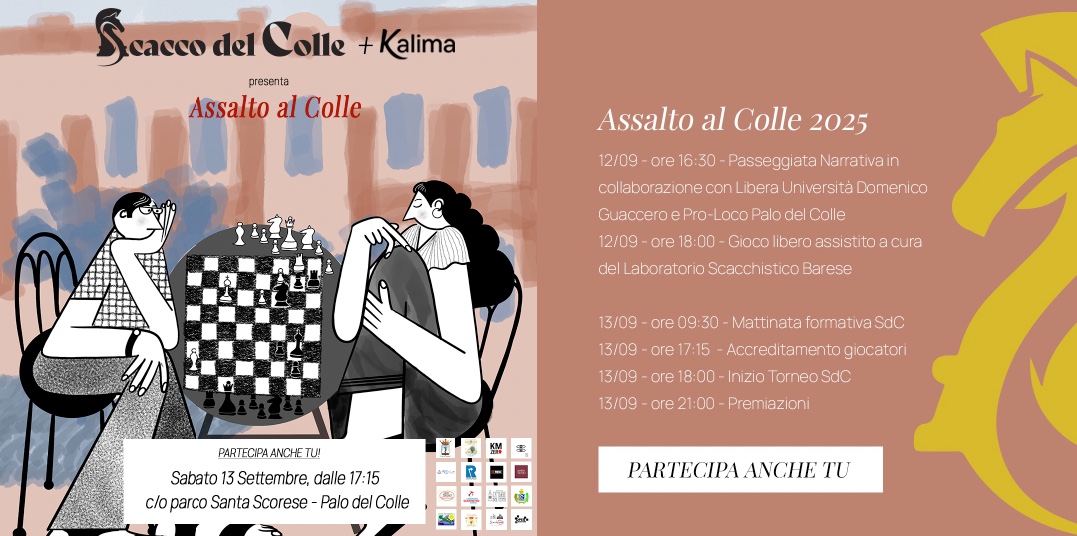 La seconda fase del torneo Scacco del Colle entra nel vivo con due giornate di cultura, formazione e gioco: la Passeggiata Narrativa di venerdรฌ 12 settembre e lโattesissimo torneo Assalto al Colle di sabato 13 settembre 2025.